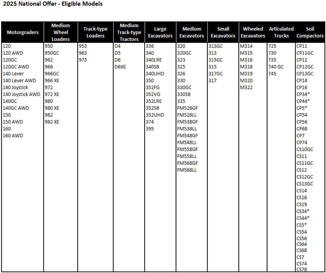 *Offer valid from January 1, 2025 through June 30, 2025 on select new GCI Cat® machines (refer to qualifying machine chart) sold by participating Cat dealers to customers in the USA or Canada. Purchase must occur during offer period. Offer subject to machine availability and credit approval by Cat Financial. Not all customers will qualify. The offered Cat® Customer Value Agreement (CVA) includes 6 maintenance parts kits; S∙O∙SSM; and 36 mo VisionLinkTM Daily. The maintenance parts cover the first 3,000 hours^ (estimated 3 years) of machine utilization. The kit contains one set of parts for regular planned maintenance under normal operating conditions. In some severe applications where maintenance parts need to be replaced more frequently, additional parts will be at customer’s expense. Offer excludes additional maintenance parts, dealer labor, wear parts, and fluids. Offer also includes a 36 month/5000 hour (whichever occurs first) Powertrain, Hydraulics and Technology Equipment Protection Plan (EPP). In some areas, EPP might be sold separately from the CVA. Offer may change without prior notice and cannot be combined with any other offers. Additional terms and conditions may apply. Contact Ring Power for details.